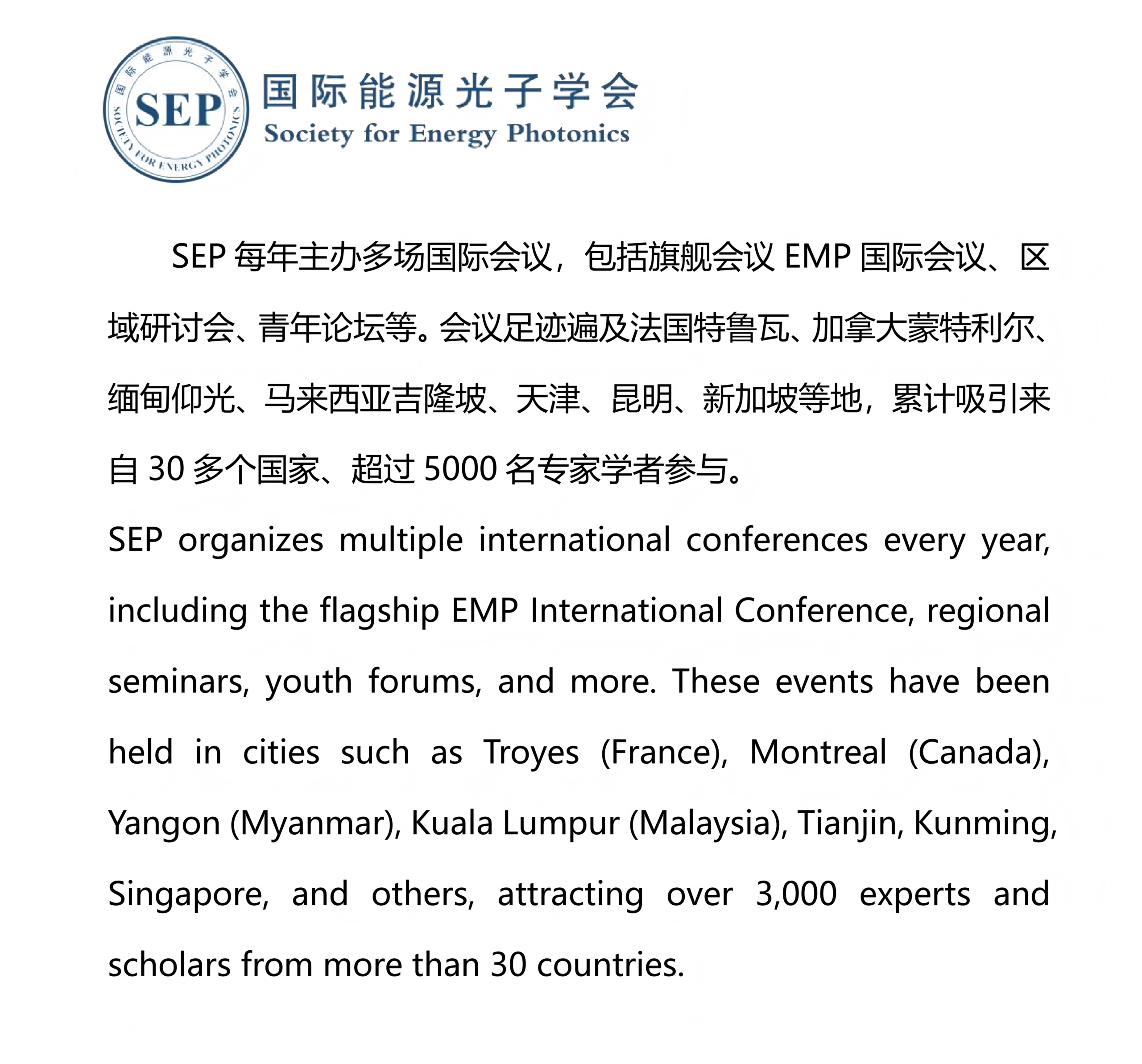 Each year, SEP hosts several high-level international conferences, including its flagship EMP (Energy, Materials and Photonics) series, regional symposia, and youth forums. The society’s footprint spans: